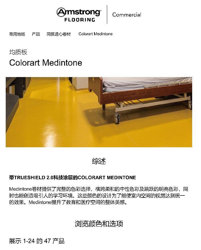 Medintone卷材提供了完整的色彩选择,横跨柔和的中性色彩及跳跃的明亮色彩,同 时也能创造吸引人的学习环境。这些颜色的设计为了能使室内空间的视觉达到统一 的效果。Medintone提升了教育和医疗空间的整体美感。